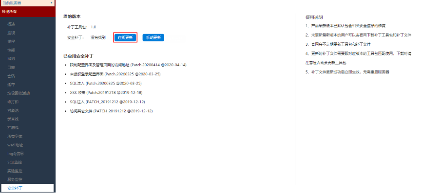 Smartbi V9.3及以后版本的用户也可登陆到管理后台,打开系统监控面板,进入“安全补丁”界面,点击“在线更新”按钮,系统会到官网上自动获取最新的安全补丁文件进行更新: