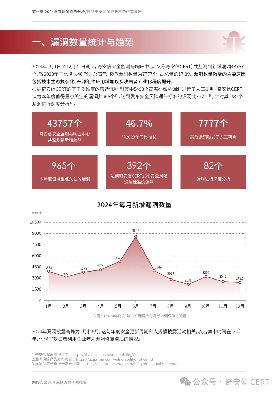 漏洞数量持续增长:2024年新增漏洞43,757个,同比增长46.7%,其中高危漏洞占比17.8%,总体漏洞威胁程度持续加深。