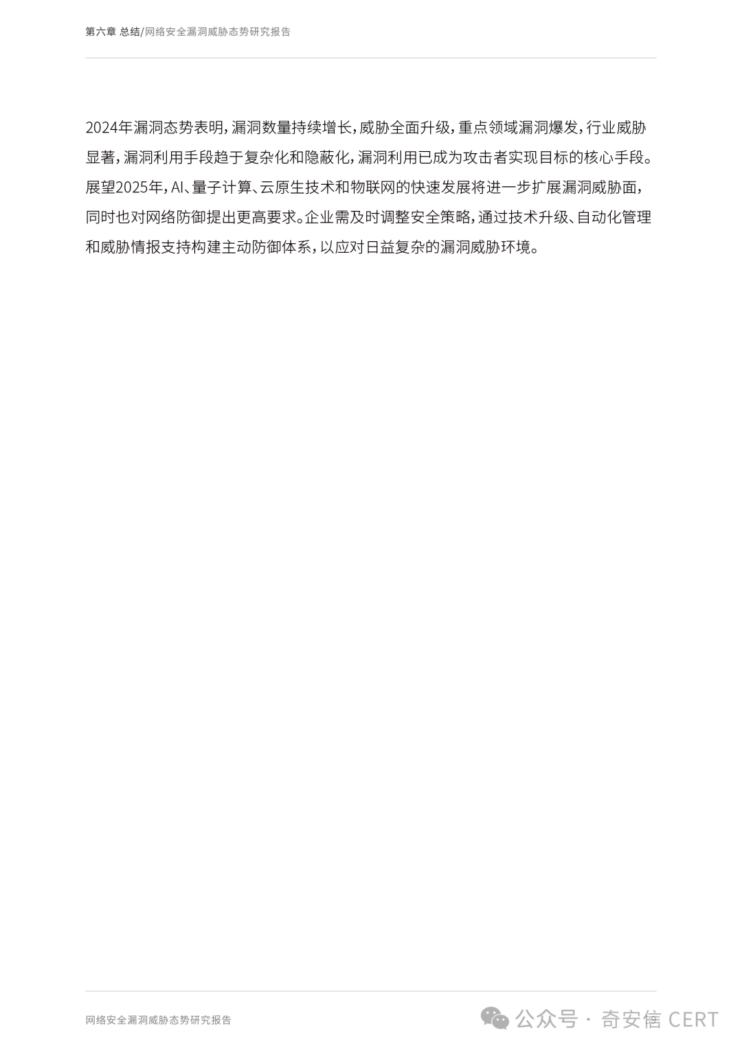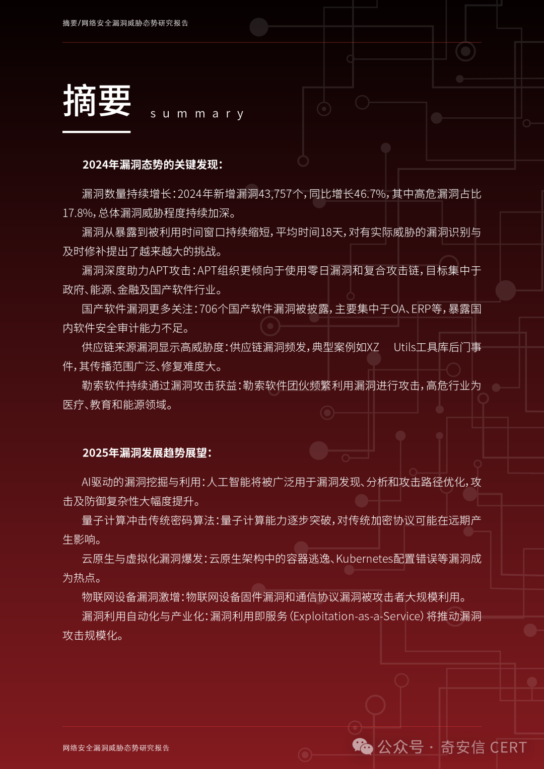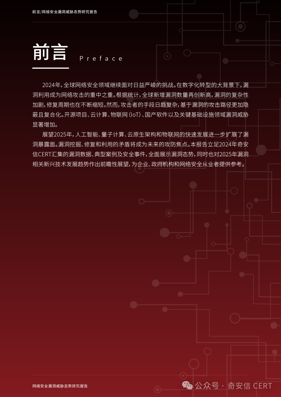展望2025年,人工智能、量子计算、云原生架构和物联网的快速发展进一步扩展了漏洞暴露面。漏洞挖掘、修复和利用的矛盾将成为未来的攻防焦点。本报告立足2024年奇安信CERT汇集的漏洞数据、典型案例及安全事件,全面展示漏洞态势,同时也对2025年漏洞相关新兴技术发展趋势作出前瞻性展望,为企业、政府机构和网络安全从业者提供参考。