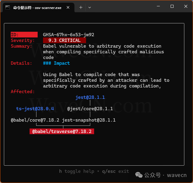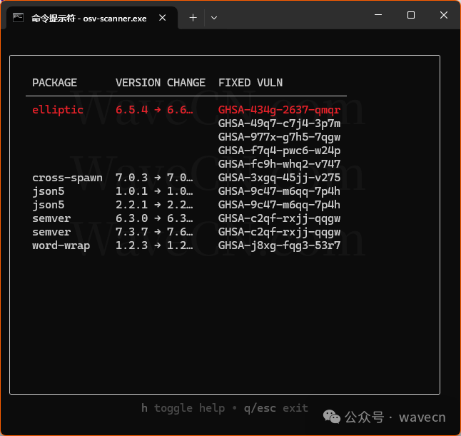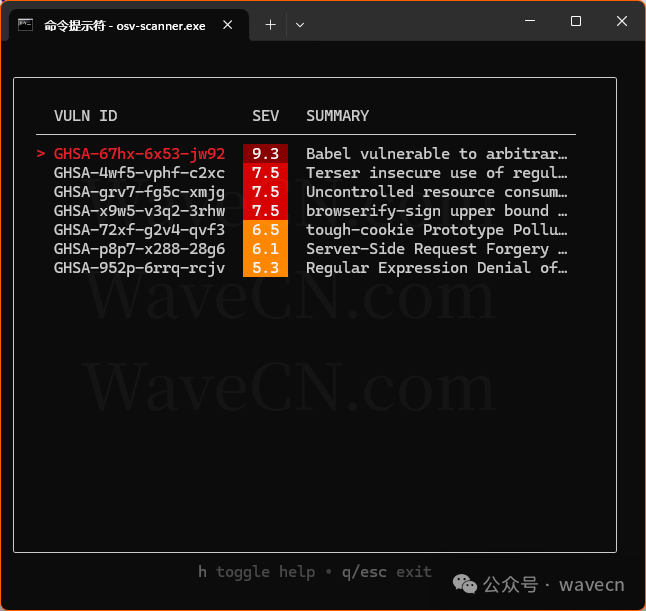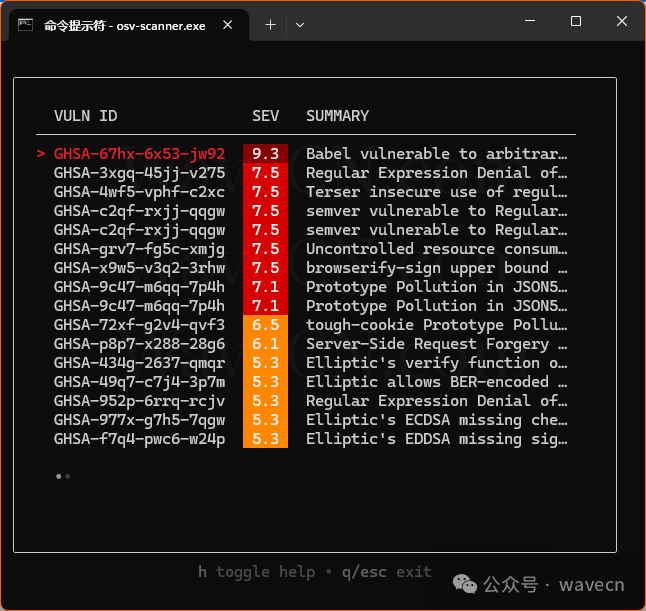 用 OSV-Scanner 不带参数扫描,结果如下:
