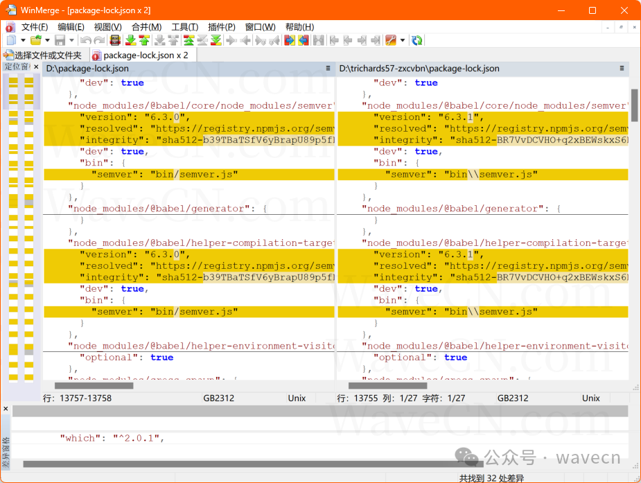在执行前笔者已经备份了 package-lock.json 文件,于是祭出笔者最喜欢的代码比较工具 WinMerge 来比较一下修改前后,如图14: