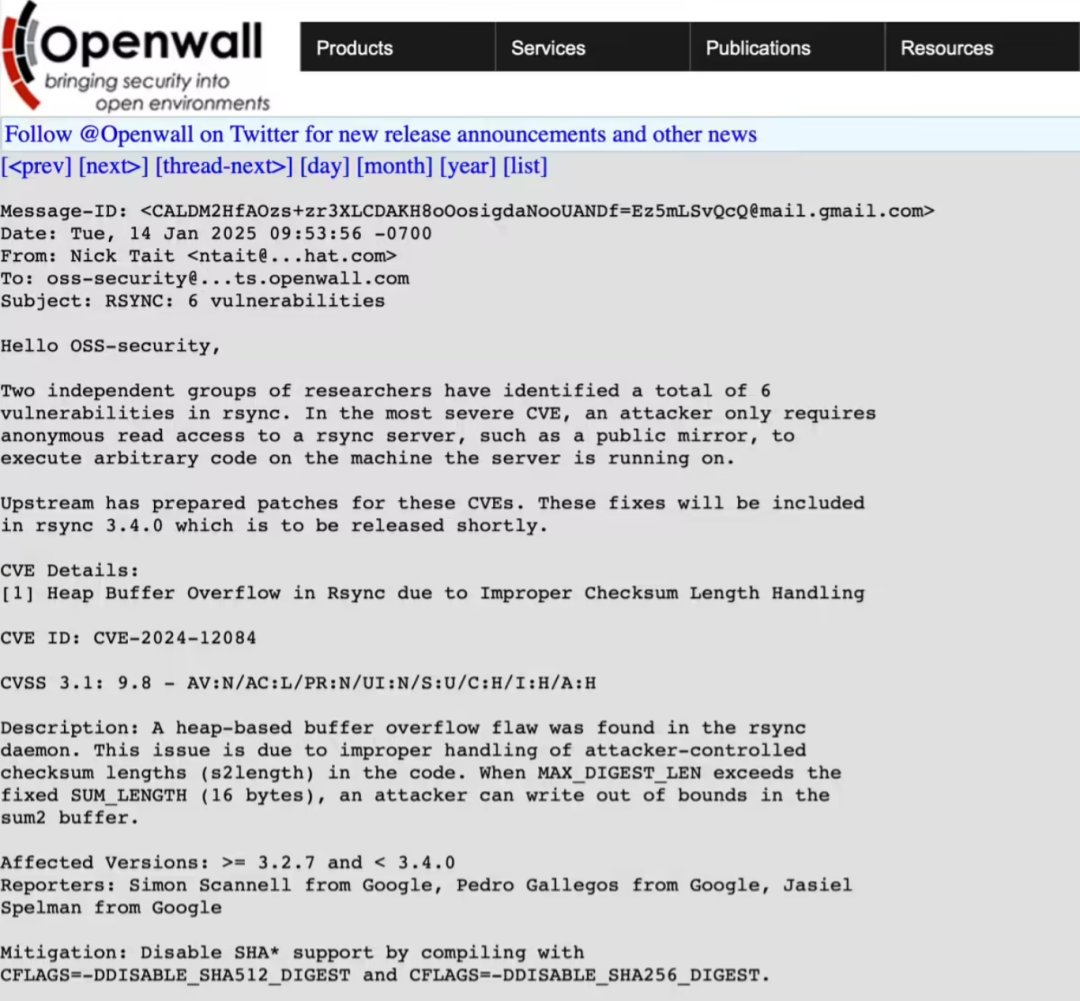 目前,rsync 已发布 3.4.0 版本,修复了相关漏洞。Red Hat 也建议所有用户尽快升级至 3.4.0 版本,以消除安全风险。对于无法立即升级的用户,建议采取临时缓解措施,例如在编译时使用特定标志禁用 SHA256 和 SHA512 摘要支持,或者通过防火墙屏蔽 rsync 服务端口(默认为 873/TCP),仅允许可信来源访问。