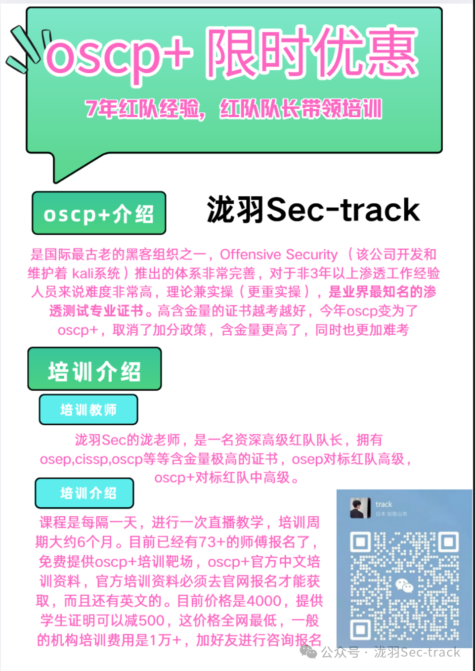有对红队工作感兴趣,或者有意报考oscp的师傅,可以考虑一下我们的培训课程,加我微信咨询,好处如下: