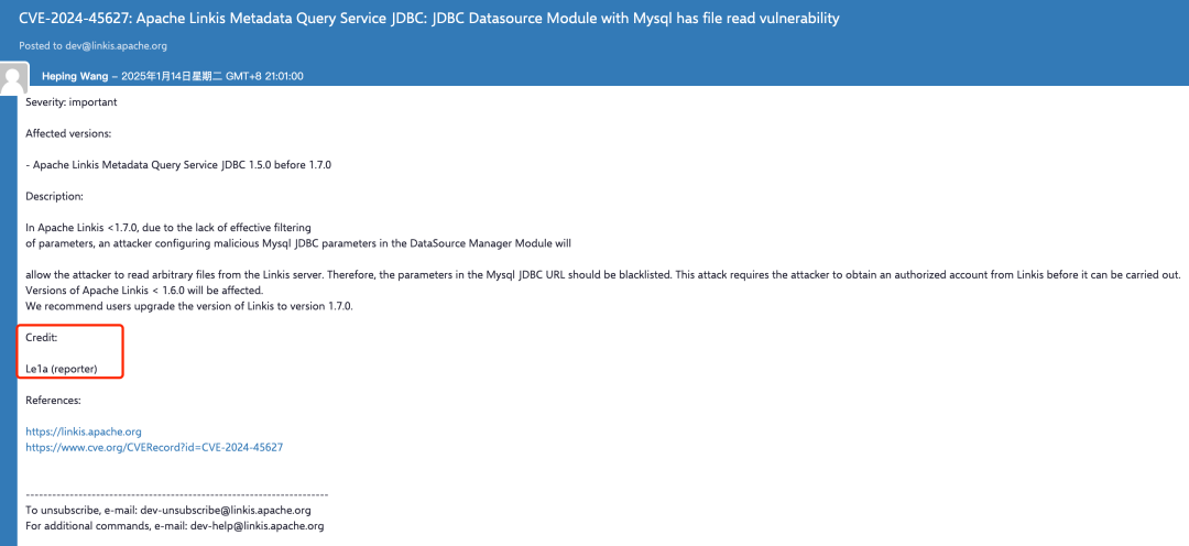 近日,Apache 官方发布了安全补丁更新,修复了一个由微步情报局安全研究员Le1a报告的漏洞 —— Apache Linkis JDBC 任意文件读取漏洞,编号为CVE-2024-45627(https://x.threatbook.com/v5/vul/XVE-2024-38770)。经过身份验证的攻击者可通过此漏洞读取系统敏感文件。
