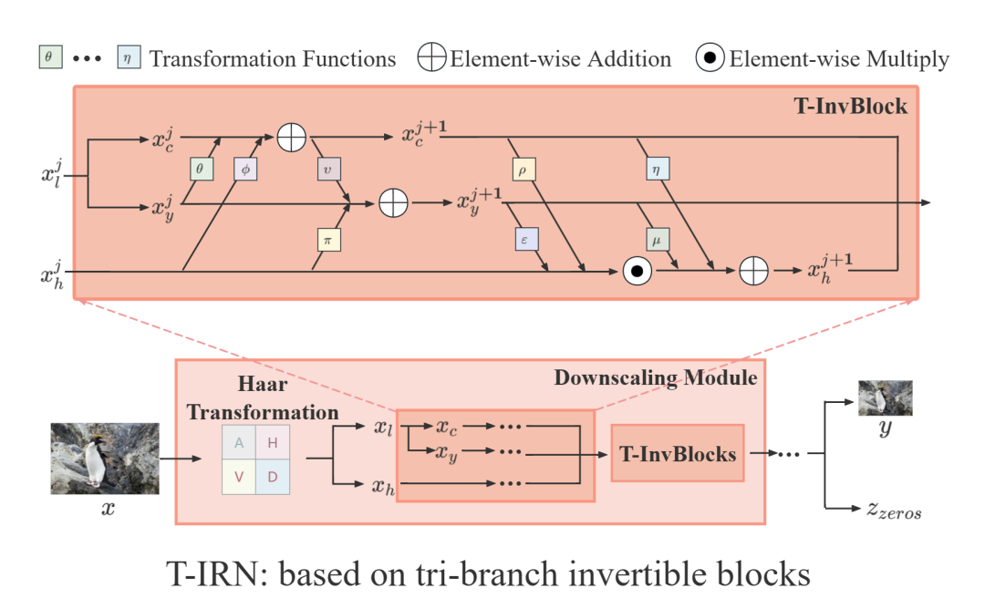 本文提出了一种即插即用的三分支可逆模块T-InvBlock(Tri-Branch Invertible Block),在传统可逆模块基础上将低频分支分离为亮度和色度分量,实现了低频信息的通道解耦和跨域信息融合。此外,本文还提出了高频信息全零映射策略,在恢复阶段使用全零张量取代分布采样作为高频信息输入,降低了分布采样引入的随机性风险,提高了恢复的准确性。结合所提出的方法,我们构建了一般场景和压缩场景下的图像重缩放模型T-IRN和T-SAIN。得益于模块的跨域信息处理能力及全零映射对目标任务的适配性,本方法在主观和客观指标上取得了业界领先的效果。
