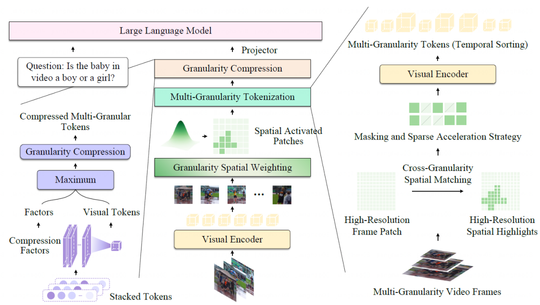 |****论文简介:视频问答在计算机视觉的发展中起着至关重要的作用,大语言模型的最新进展进一步推动了该任务的进步。然而,当前的视频问答技术在捕获视频空间维度上的细粒度视觉内容方面仍然存在一些局限性,这主要是由于视频帧固定的和低分辨率的输入引起的。虽然一些使用高分辨率输入的方法可以在一定程度上缓解这个问题,但它们由于对整个高分辨率帧进行编码而引入了过多的计算负担。在这项工作中,我们提出了一种用于视频问答的粒度自适应空间证据编码模型。我们的方法在空间维度上引入了多粒度视觉编码,以根据问题生成各种粒度的视频标记。模型通过粒度加权模块突出显示低分辨率帧的空间激活补丁,然后自适应地在高分辨率帧中编码这些激活补丁以补充细节。为了减轻高分辨率帧编码带来的计算开销,我们开发了一个掩码和加速模块,以实现高效的视觉标记化。此外,粒度压缩模块用于根据输入的文本问题动态选择和压缩不同粒度的视觉标记。我们在十一个主流视频问答数据集上进行了广泛的实验,结果验证了我们方法的有效性。