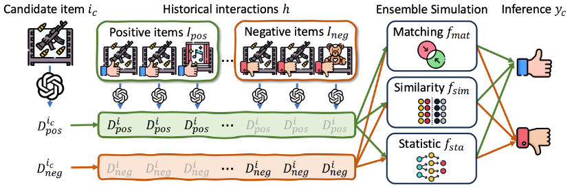基于这一交互逻辑,我们设计了一种基于大语言模型的用户模拟器,用于显式模拟用户的交互过程(如下图)。具体而言,我们通过大语言模型分析商品,生成可能的喜欢或不喜欢原因,并总结为关键词。这些关键词既基于商品的客观描述,也来源于用户的评价文本,从而涵盖了商品的客观与主观特征。
