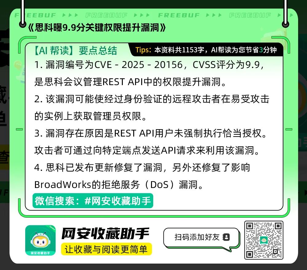 近日,思科发布软件更新,解决影响会议管理的关键安全漏洞。该漏洞可能使经过身份验证的远程攻击者在易受攻击的实例上获取管理员权限。漏洞编号为CVE – 2025 – 20156,CVSS评分为9.9(满分10.0),是思科会议管理REST API中的权限提升漏洞。
