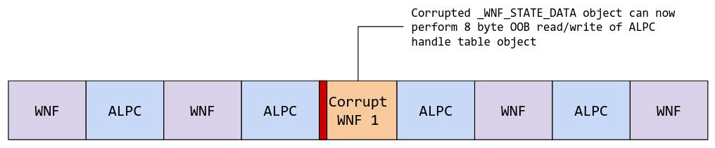 对象可用于从 ALPC 句柄表对象中泄露内核指针。然后使用第二次缓冲区溢出来破坏另一个_WNF_STATE_DATA