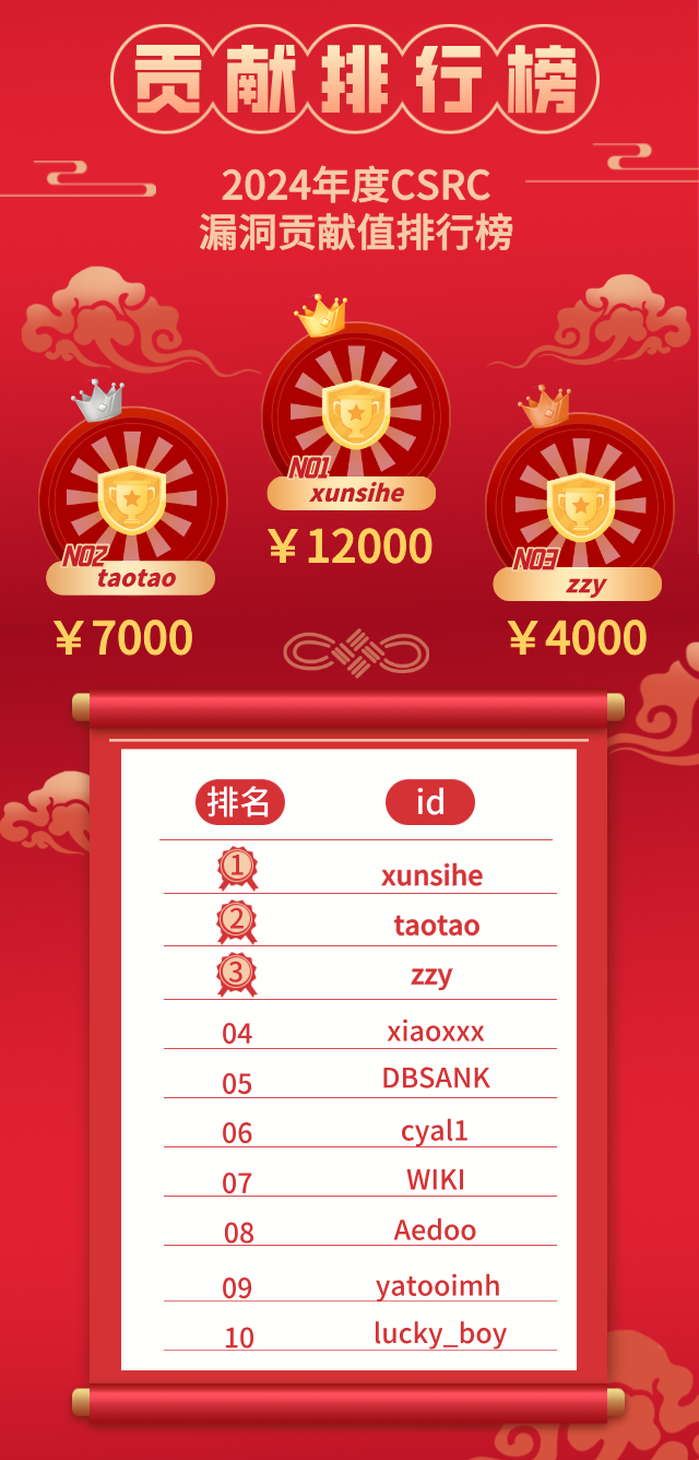 此刻,即将揭晓携程SRC2024年度白帽子荣誉榜单,这份荣耀,专属于你们!为了表彰卓越,我们为前三甲的白帽子精心准备了年度奖金。同时,排行榜前十名的白帽子也将收获携程特别定制的新春礼盒,这些心意,正通过快递一一送达。在此,我们向每一位安全领域的守护者致以崇高的敬意!