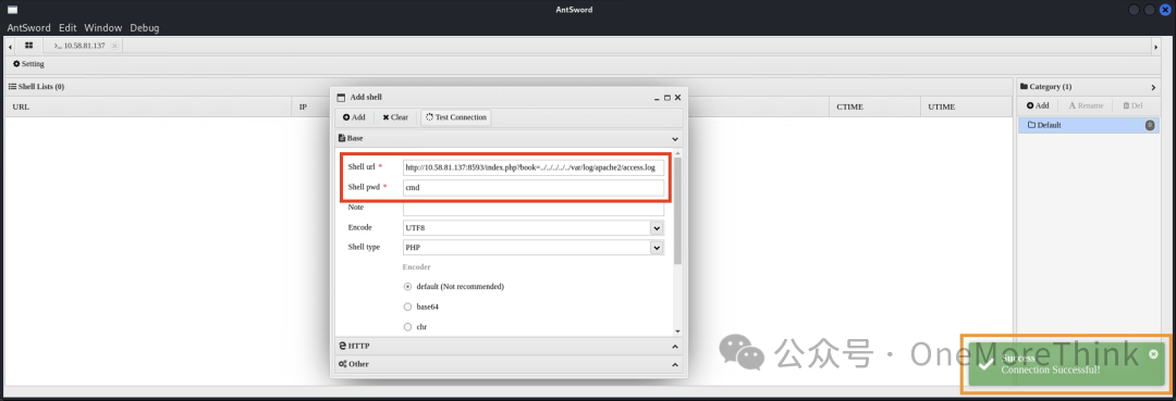 在请求头UA字段中添加webshell,使用蚁剑连接http访问日志,最终获得www-data用户权限。
