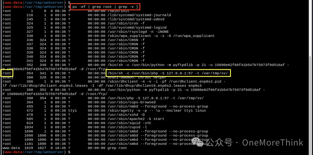 查看root用户启动的进程,发现root用户在本地回环地址的57端口上启动了web服务。