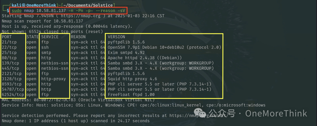 对靶机进行全端口扫描、服务扫描、版本扫描,发现: