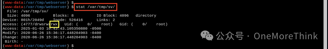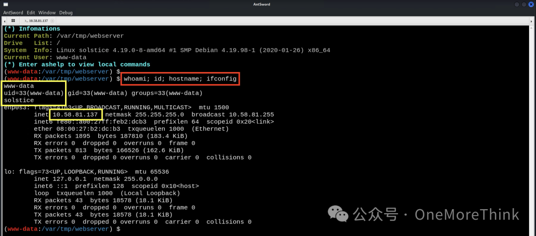 当前www-data用户在该web服务根目录中有写入权限,可以写入webshell文件。