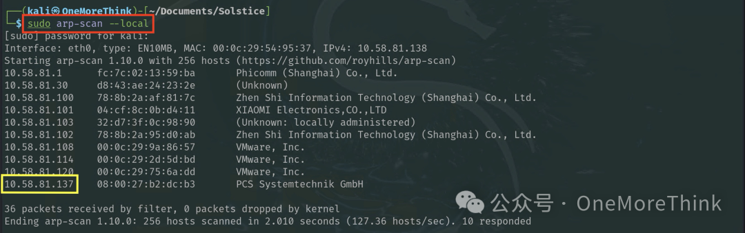 靶机启动后,没有提供IP地址。由于Kali和靶机在同一个C段,可以扫描ARP协议获取靶机IP地址。