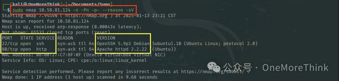 对靶机进行全端口扫描、服务扫描、版本扫描,发现22/SSH、80/HTTP。