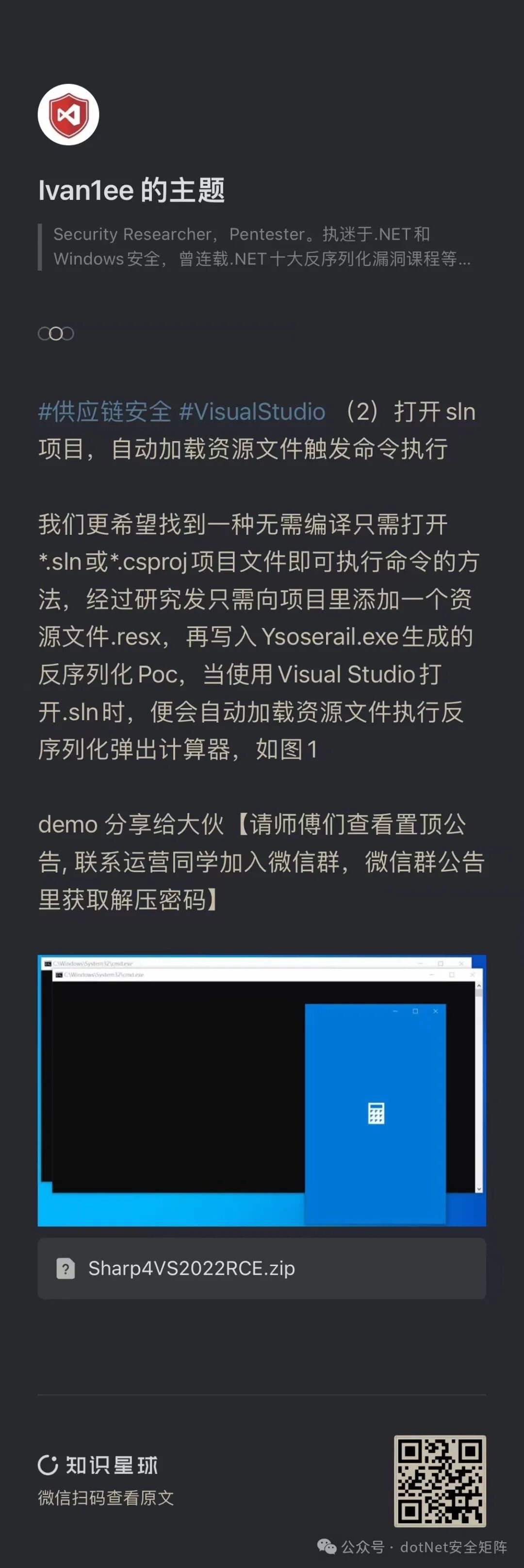 攻击者并不需要对目标项目文件进行复杂的修改,只需在项目中插入恶意资源文件或修改项目配置文件,攻击就能够成功触发,我们已经在星球给出了概念性的验证项目 Sharp4VS2022RCE,如下图所示。