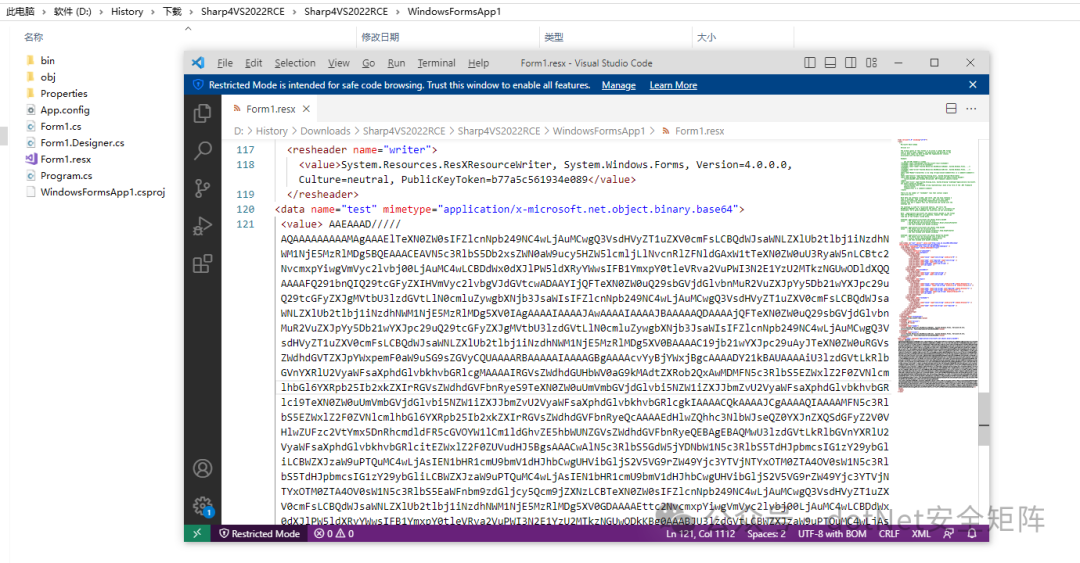 攻击者通过将恶意载荷嵌入到Visual Studio的资源文件(.resx文件)中,并将该文件添加到项目中。当开发人员打开Visual Studio项目文件(如 .sln 或 .csproj 文件)时,Visual Studio会自动加载该资源文件。此时,恶意的反序列化载荷将被触发,从而执行攻击者的代码。