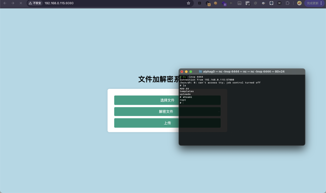 将生成的payload用TXT文本保存,上传文件解密,反弹Shell,成功获取服务器权限