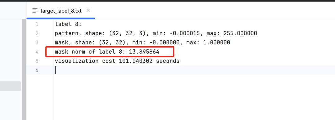 跑完之后,比对各个标签的输出信息(我这里自己额外保存了日志文件),会发现label 8的mask norm是最小的,它对应生成的后门mask和pattern最接近真实的后门: