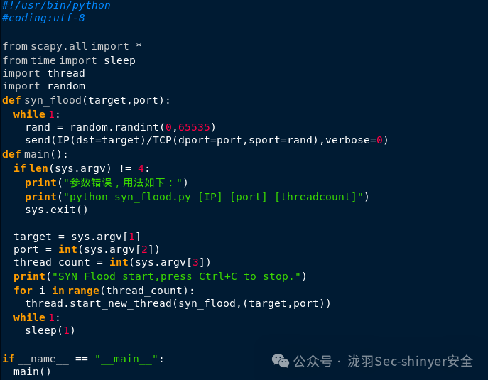 接下来我们就可以把刚刚构造数据包的思路加上多线程模块写成一个SYN FLOOD攻击脚本,代码如下