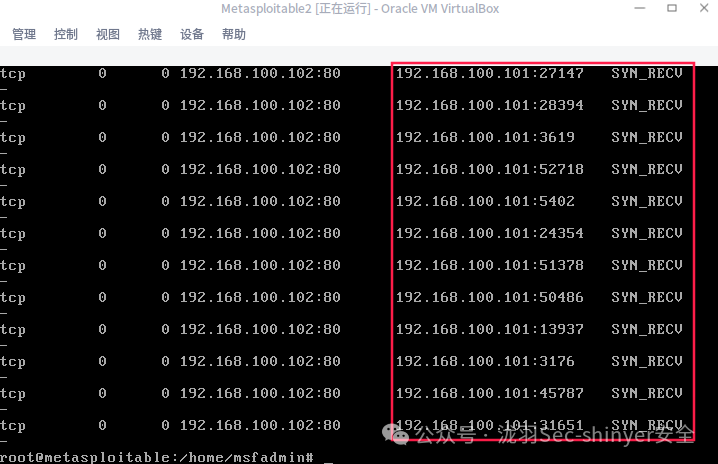 我们再登录服务器(metasploitable2)上,查看服务器所建立的连接。使用命令netstat -pantu | grep SYN查看已建立的SYN连接数,可发现此时已建立了大量连接
