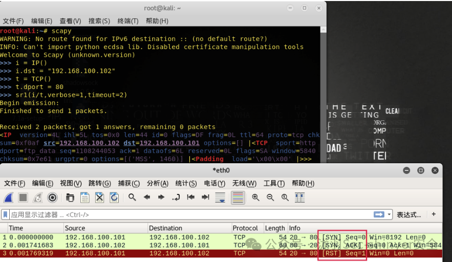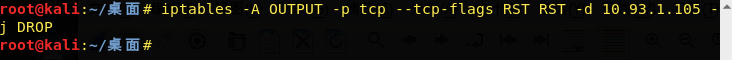 在发送数据包的同时,我们打开wireshark抓包,可以看到目标服务器成功给我们返回SYN+ACK数据包,但是第三个数据包确实RST数据包而不是ACK数据包,这是怎么回事?其实这个RST数据包是系统自己发送的,原因在于一开始的SYN数据包是我们使用scapy发出的,并不是操作系统自己主动发出的,所以当操作系统收到一个SYN+ACK数据包时,它会认为这个连接不是我发出的,就会主动拒绝连接,并返回RST数据包。既然这样,我们可以使用linux下的iptables命令禁止系统自动给目标发送RST数据包,从而达到建立半开连接的效果,命令如下