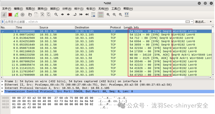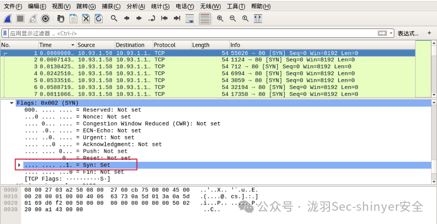 打开wireshark抓包,可以看到抓取到大量的SYN请求数据包,而且已经没有RST数据包了
