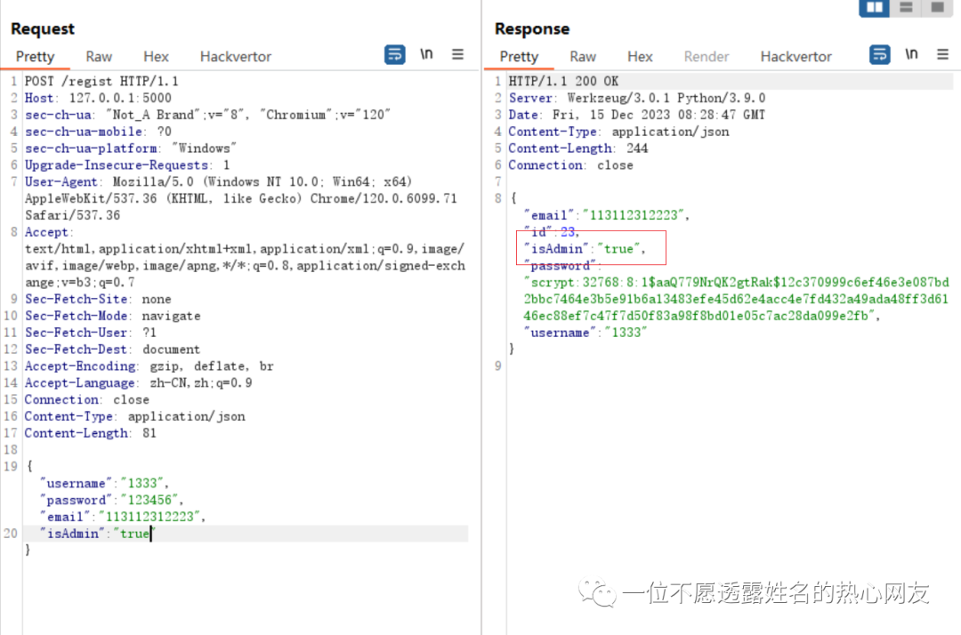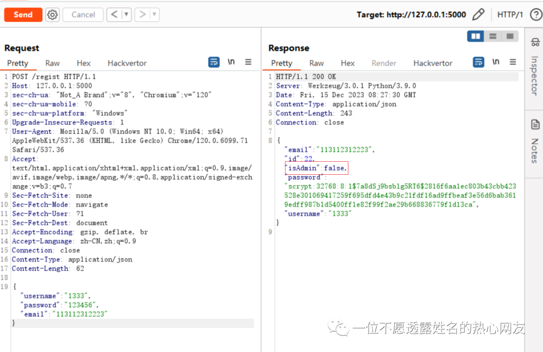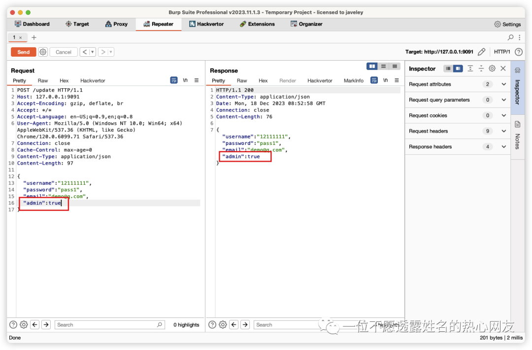 如果请求中的 Admin 值绑定到User对象而没有进行充分的验证和清理,则可能会错误地向用户 test授予管理员权限。