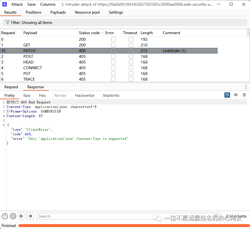 使用内置content discover 扫描功能也只能发现这个路径。根据上面说的几点,拓展利用。尝试HTTP方法枚举,发现PATHCH方法会报错内容类型错误