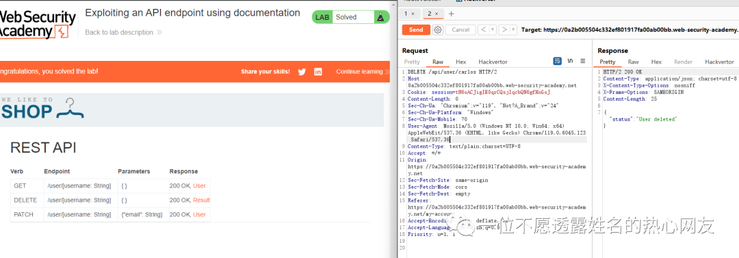 通过暴露的API端点位置,想办法删除carlos账户;账户:wiener:peter