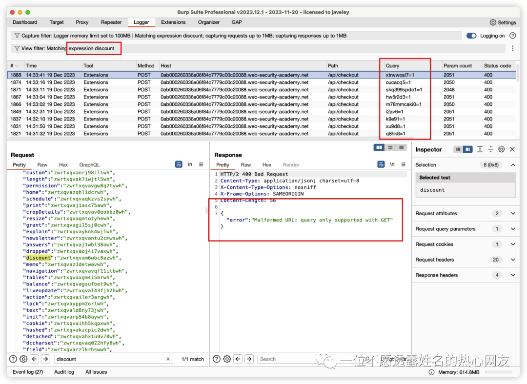正常一切按照默认配置走,会发现Param miner会自动在POST请求中会自动添加Query查询参数,结果就是Response不支持POST中携带Query参数