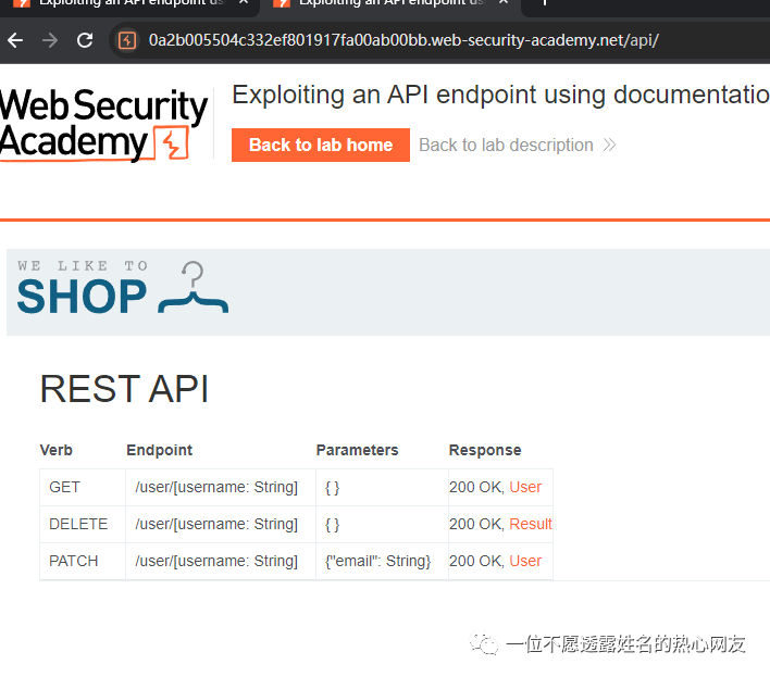 Lab: Exploiting an API endpoint using documentation | Web Security Academy (portswigger.net)