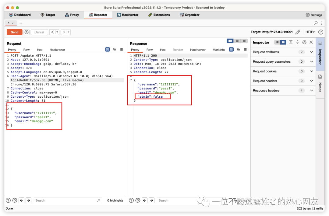 这可能表示返回的id 和 isAdmin 参数与/api/users/update接口更新的用户名和电子邮件参数,可能会作为隐藏参数一起绑定到内部User对象。