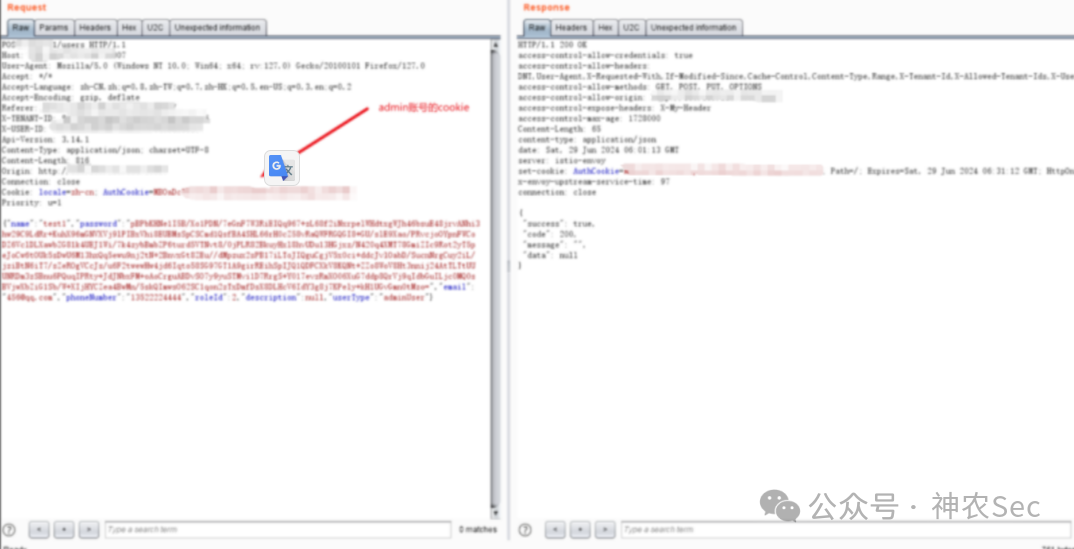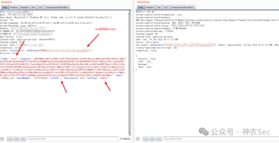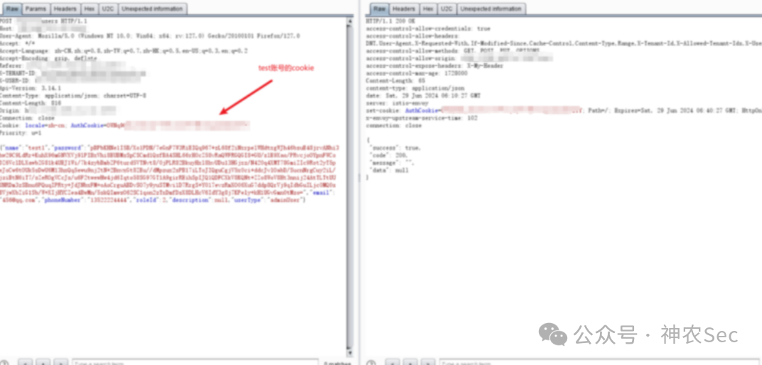 请求成功,test1账号创建成功,存在垂直越权漏洞。