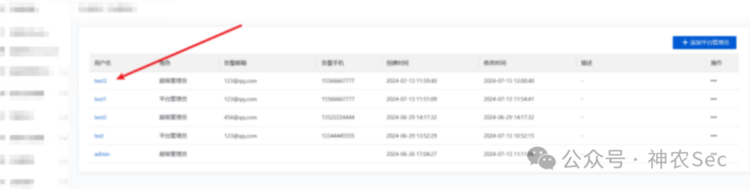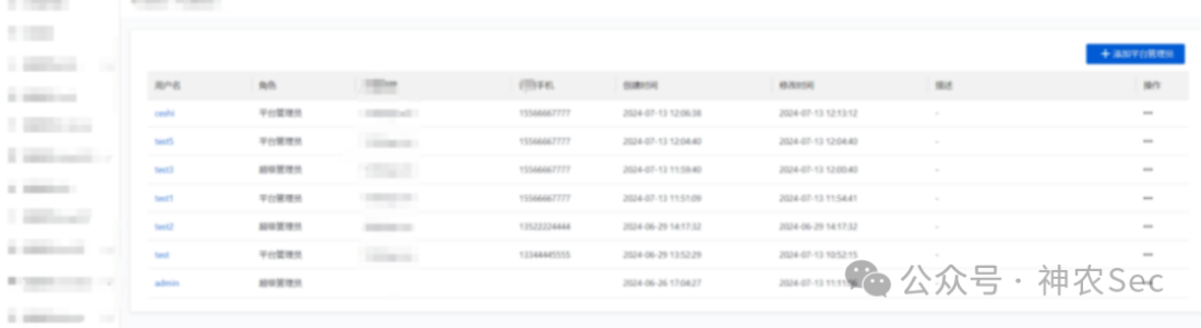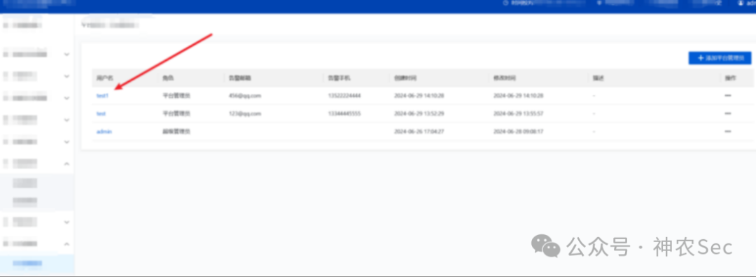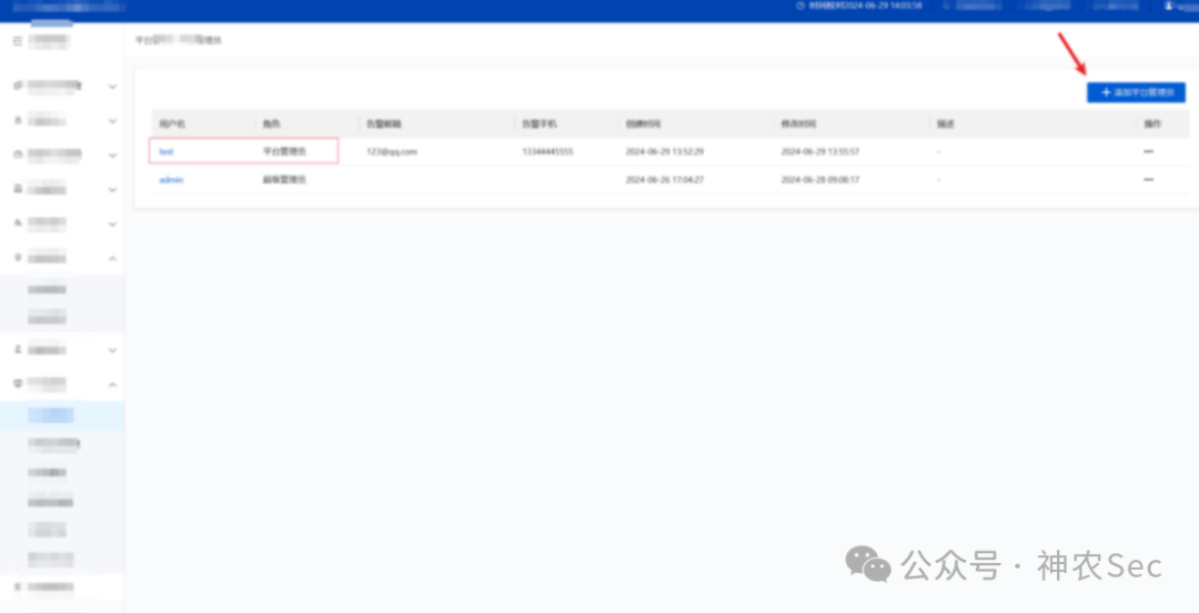 话不多说,在某个平台先添加一个平台管理员测试账号test,admin是当前系统登录的账号,属于超级管理员。
