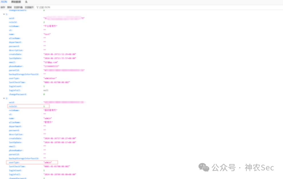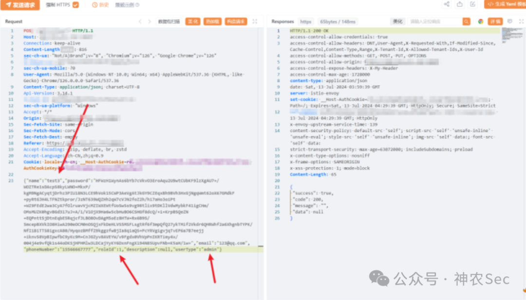 使用超级管理员账号添加普通管理员并抓包,修改roleId为1和userType为admin,发现仍然可以添加超级管理员账号test3,且test账号可正常登录。