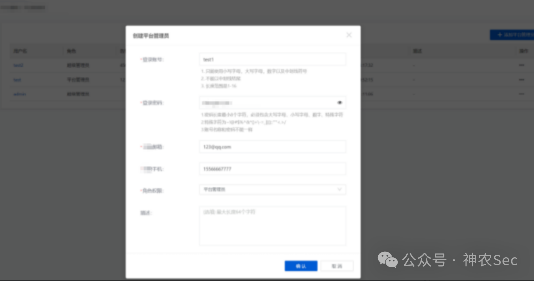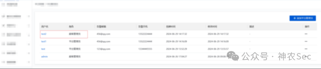 使用test账号甚至可以直接创建超级管理员账号test2。