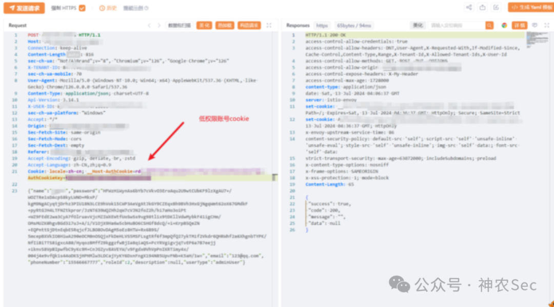 将数据包中的cookie替换为低权限账号的cookie,然后发送,仍然显示添加成功。