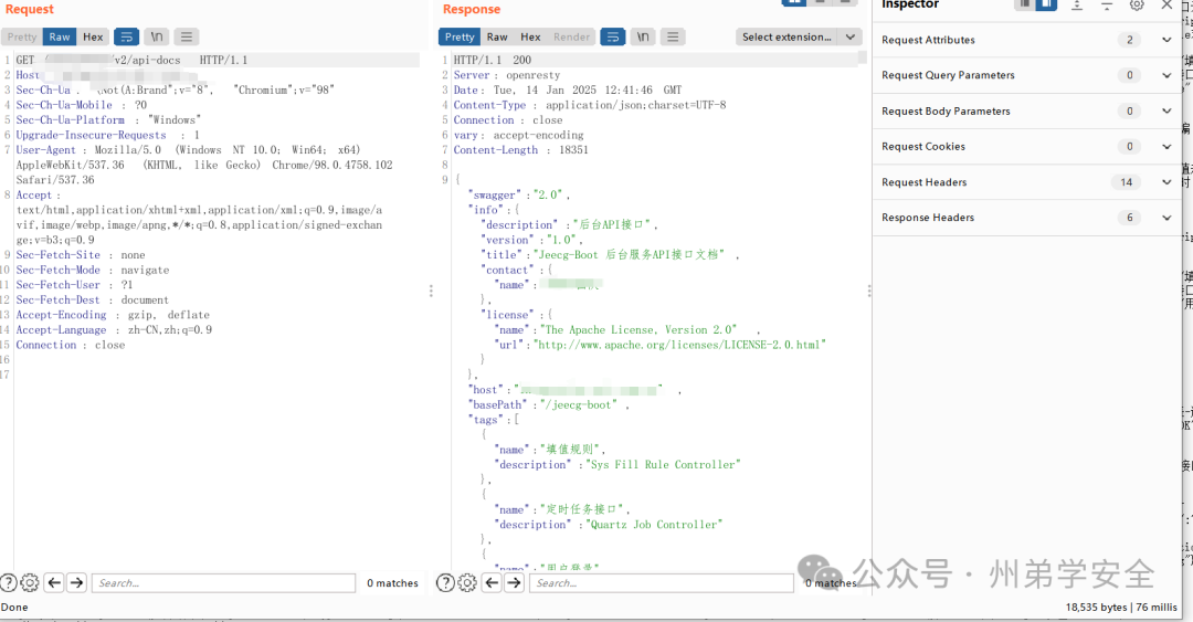 一般情况下,有卧龙的地方必有凤雏,很多用若依框架的,还会用:spring boot actuator、swagger-ui、druid服务,以方便管理,跟着抓到的api枚举就行了,这里用插件直接爬,首先看到了swagger