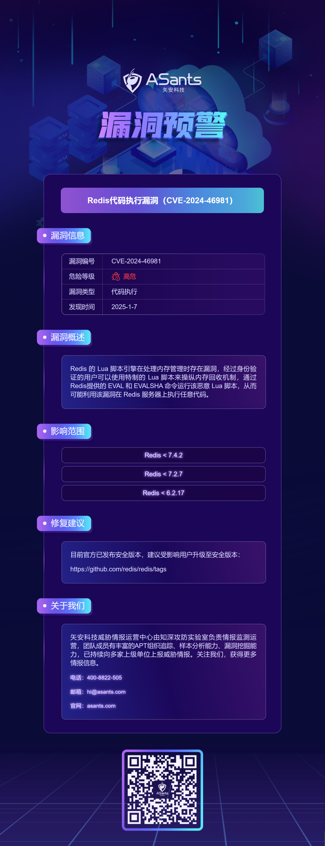 漏洞预警|Redis代码执行漏洞(CVE-2024-46981) 发布于2025年1月7日2025年7月19日 作者:cve-20 漏洞预警|Redis代码执行漏洞(CVE-2024-46981) 威胁情报运营中心 矢安科技 2025-01-07 11:25