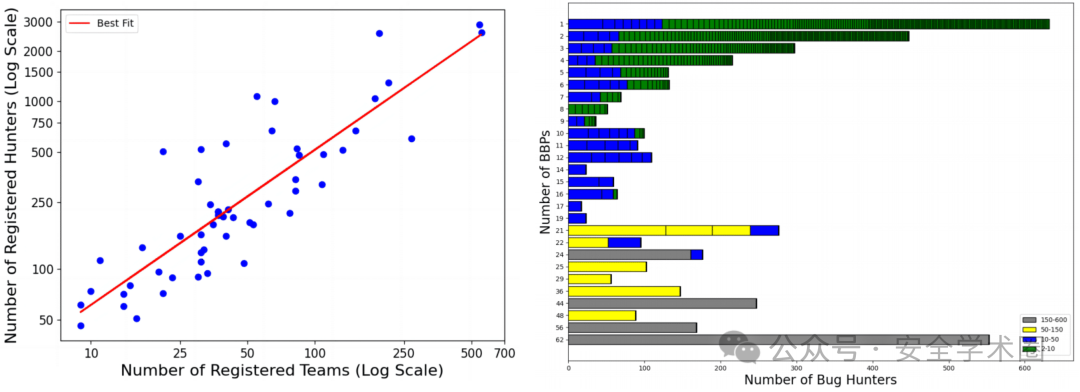 通过跨平台身份链接,作者分析了漏洞赏金生态系统中不同团队的规模。