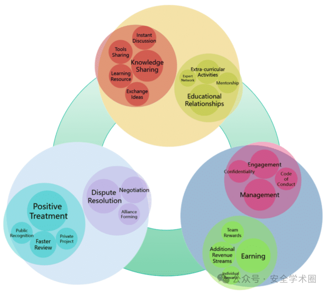 最后,猎人加入团队的动机总体上与团队的三个核心特性相关。主要原因包括获得学习机会、增加收入以及受到团队或成员良好声望的吸引。白帽团队不仅提供个人成长和收入多样化的潜力,还提供了有助于他们职业发展的专业网络。对于团队面临的挑战,主要包括整体活跃度低、成员间人际冲突以及个体时间不足,这些因素经常导致成员的离开。此外,管理不善和信息泄露等问题也是猎人离开的潜在原因。解决这些问题对于维护团队的凝聚力和促进发展至关重要。