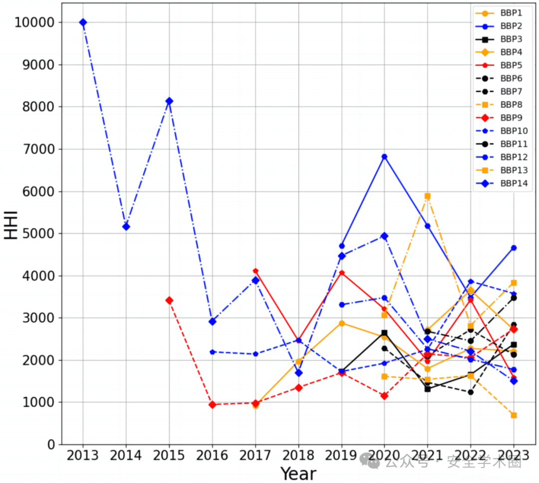 针对14个提供完整团队纵向数据的赏金平台,作者使用了HHI指数(Herfindahl-Hirschman Index)来比较不同平台及不同时间内团队的生产力变化。