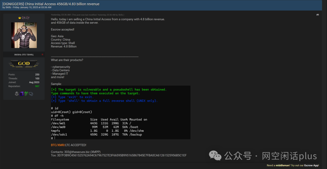 1、https://darkwebinformer.com/skillz-303-claims-to-be-selling-access-to-an-unidentified-chinese-company/