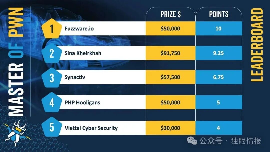 首日,白帽黑客在车载信息娱乐系统(IVI)、电动车充电桩和操作系统中成功利用了16个此前未知的漏洞。大会向参与者颁发了高达382,750美元的奖金。