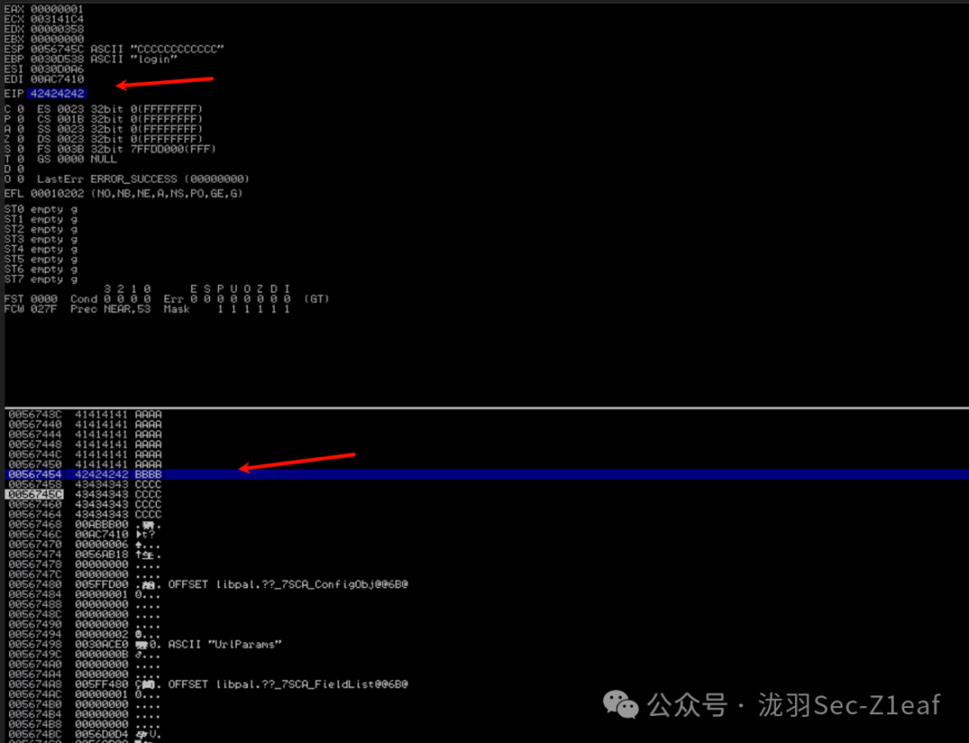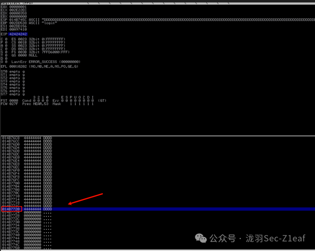 发现EIP 寄存器地址为42424242,那么就是大写的BBBB,确认了这个地址的信息了。