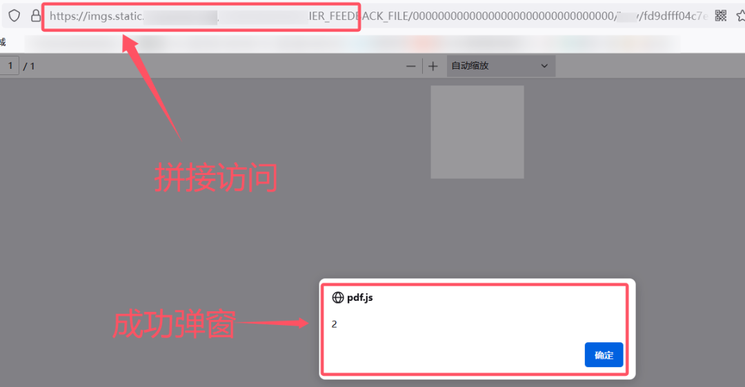 5.尝试拼接https://img.xxx.com/+x.pdf 最终访问pdf地址成功执行xss代码,弹窗2,白捡一个洞,这个要看有没有说明不收pdf型xss,收的话就是一个中危500到手。