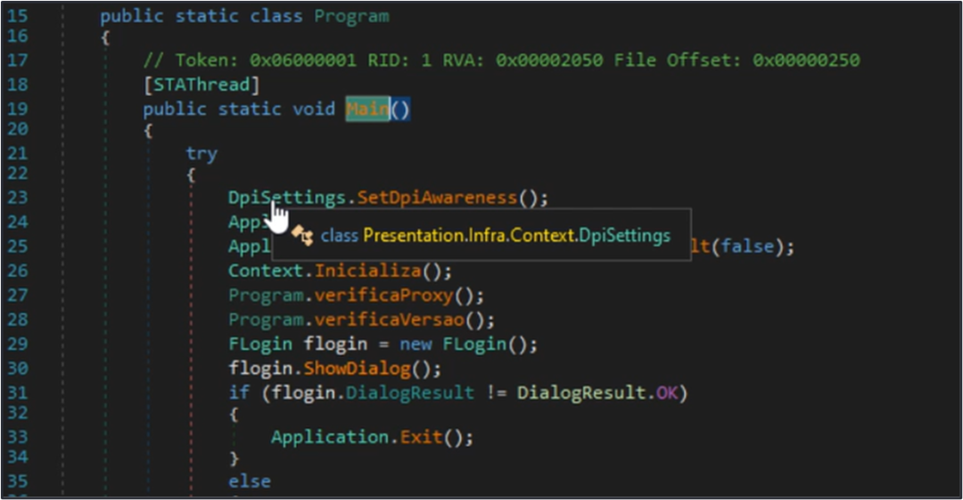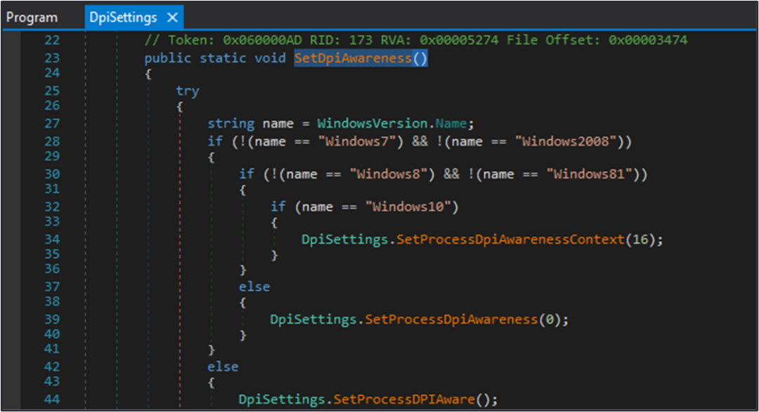 使用 DnSpy 从目标 .NET 程序集的入口点开始,我们跟踪代码到第一个方法调用”SetDpiAwareness()”。此函数存在于之前识别的 DLL 之一中: